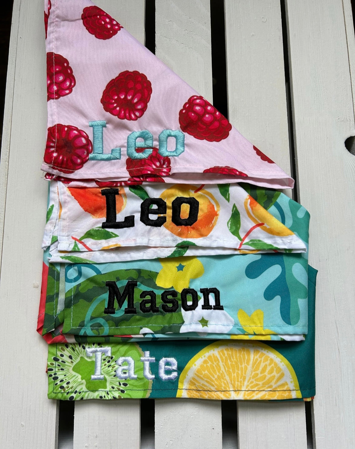 Get your dog or pet ready for summer with a custom embroidered bandana. Select the size and provide personalization details, options will be sent via message.