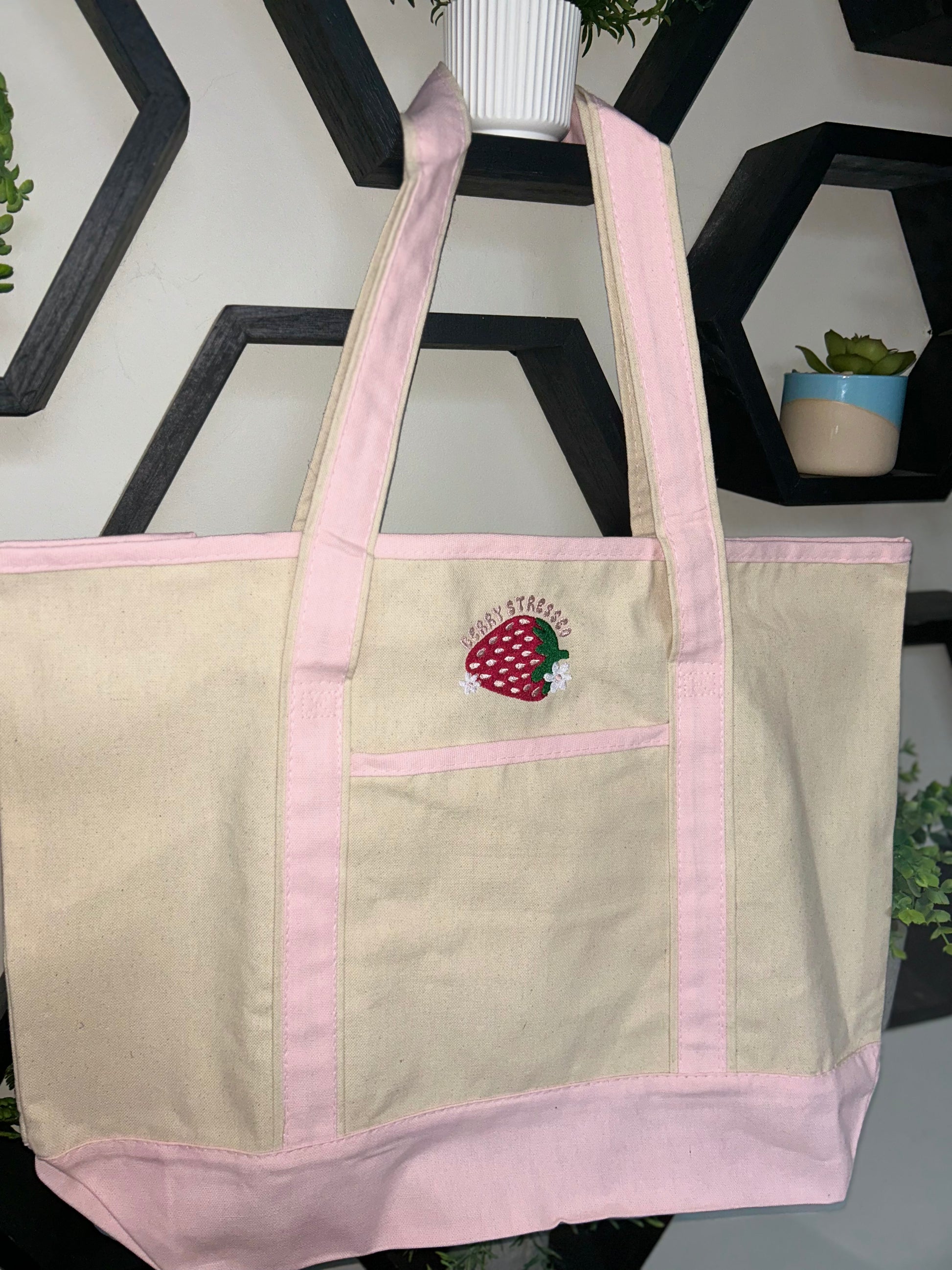 Embroidered Berry Stressed 34L Canvas Tote Bag with Pink Straps & Zipper Pouch