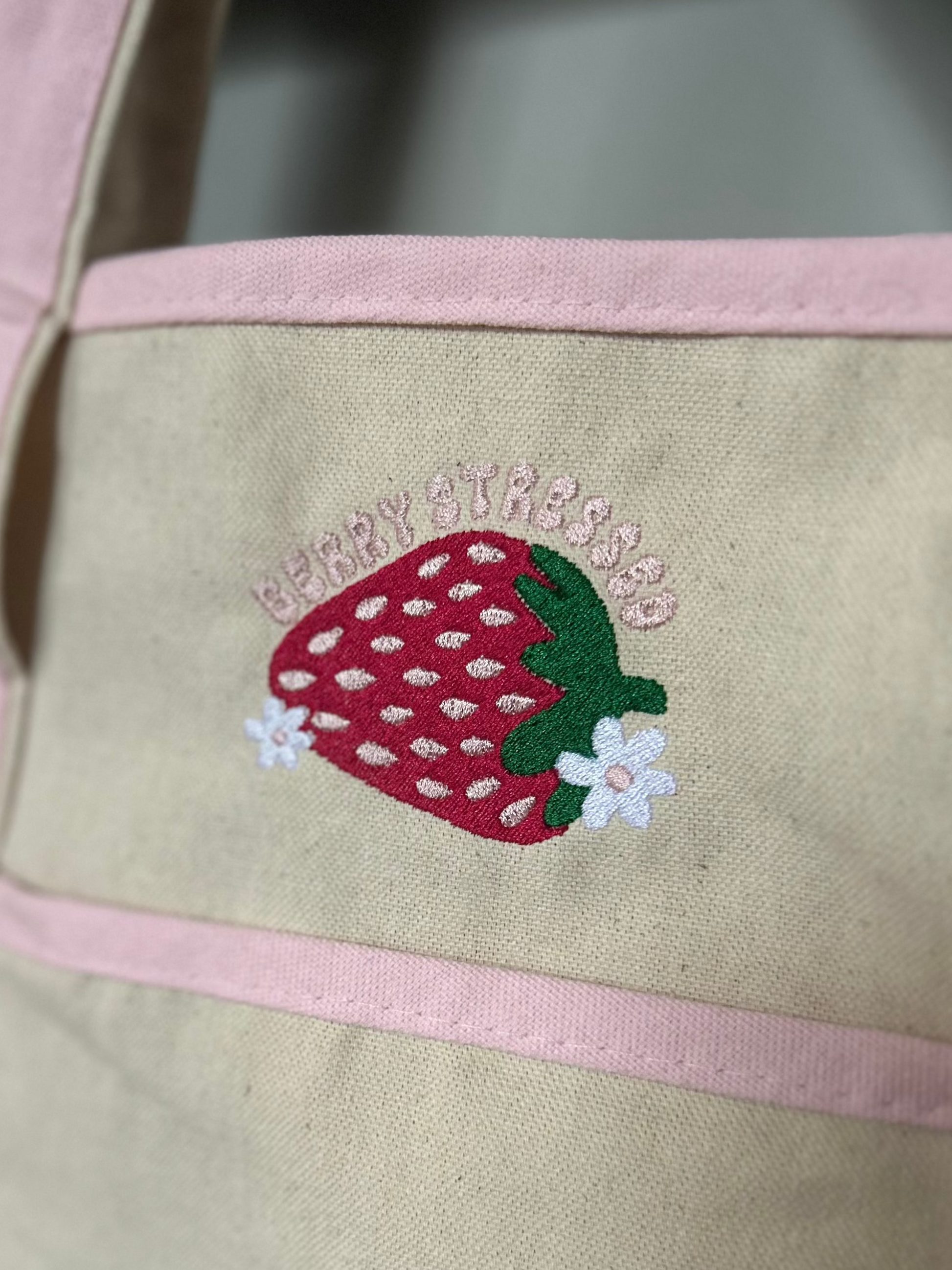 Featuring vibrant, eye-catching pink straps and a fun Berry Stressed embroidery on the front, it’s a cheeky way to express yourself while staying organized. The bag includes a convenient zipper pouch inside, perfect for keeping smaller items like your keys, phone, or makeup neatly tucked away.
