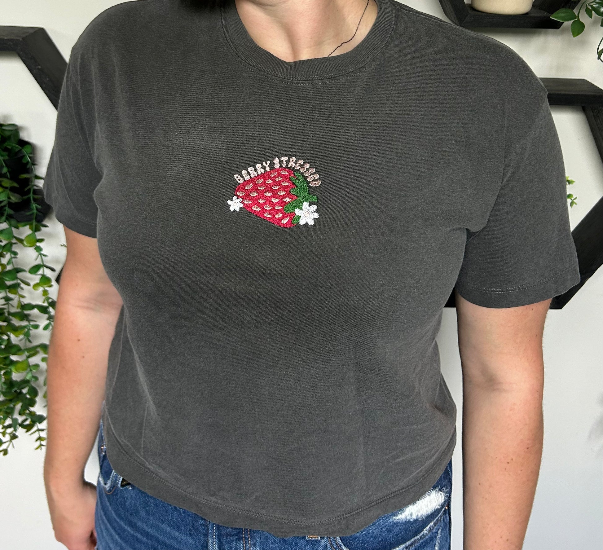 This strawberry tee puts a fun twist on the stress we are all feeling. This design is embroidered on a Comfort Colors Pepper Boxy Crop Tee.