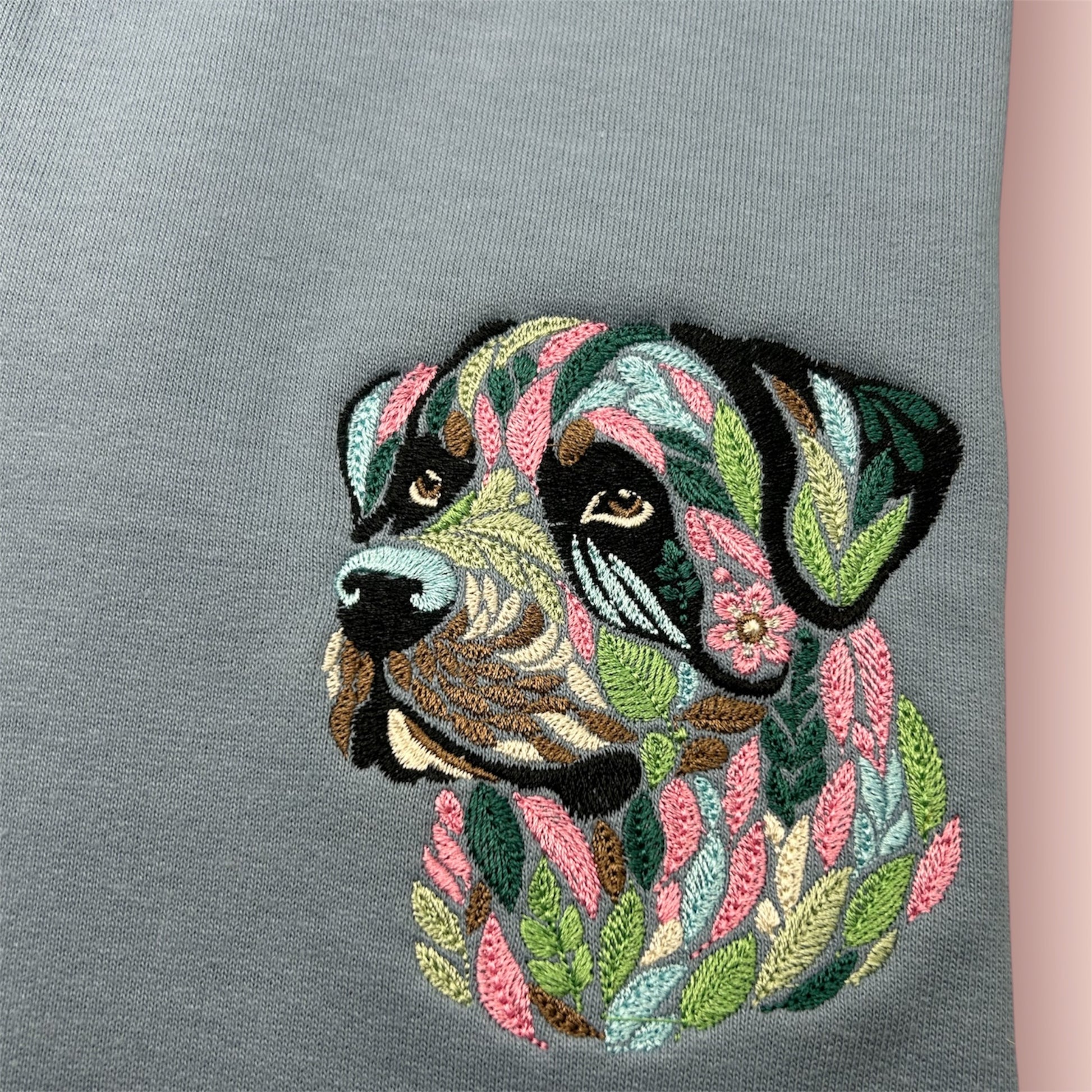 • Premium Embroidery: A Rottweiler composed of florals and leaves for a unique, artistic touch.