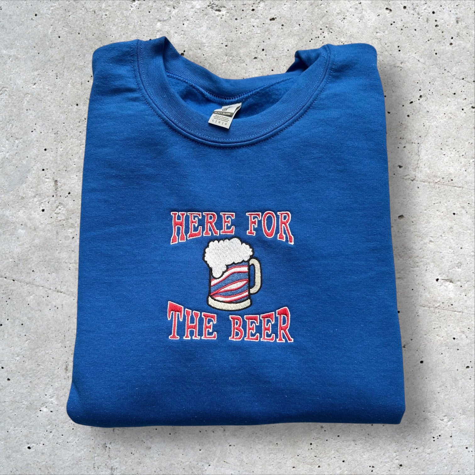 - Bold "Here for the Beer" embroidered graphic for a fun, standout look