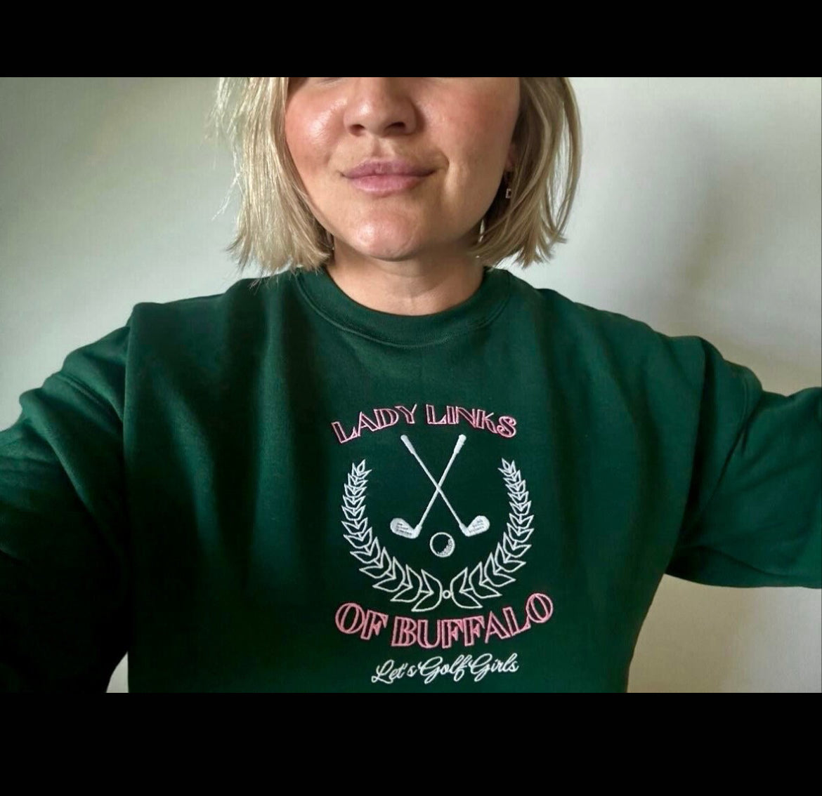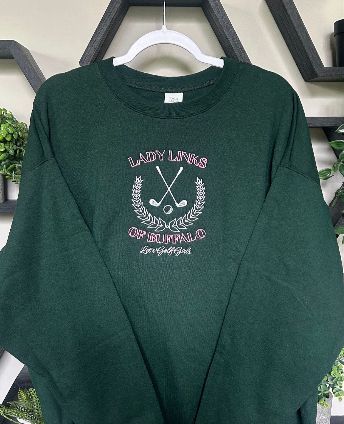 In collaboration with The Lady Links of Buffalo, this beautiful green and gray crewneck was created. This is the perfect crewneck for your next golf outing or range session. This design features text that is embroidered on a crewneck in the color of your choice (green or gray).