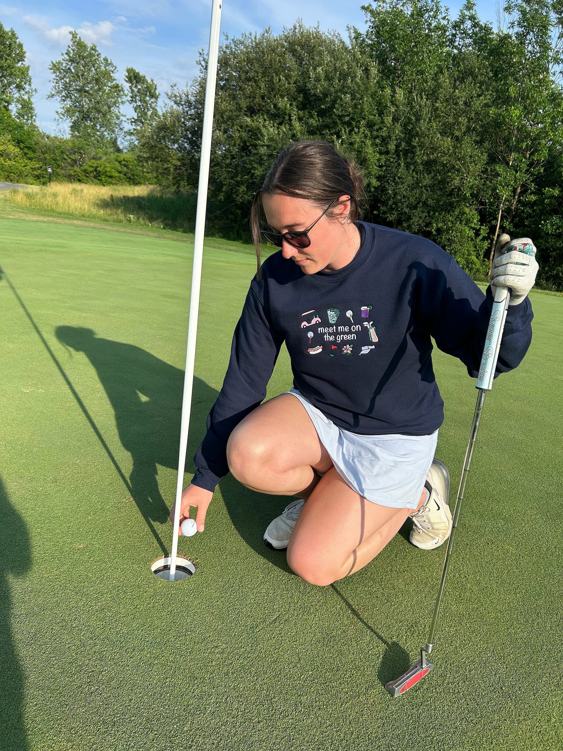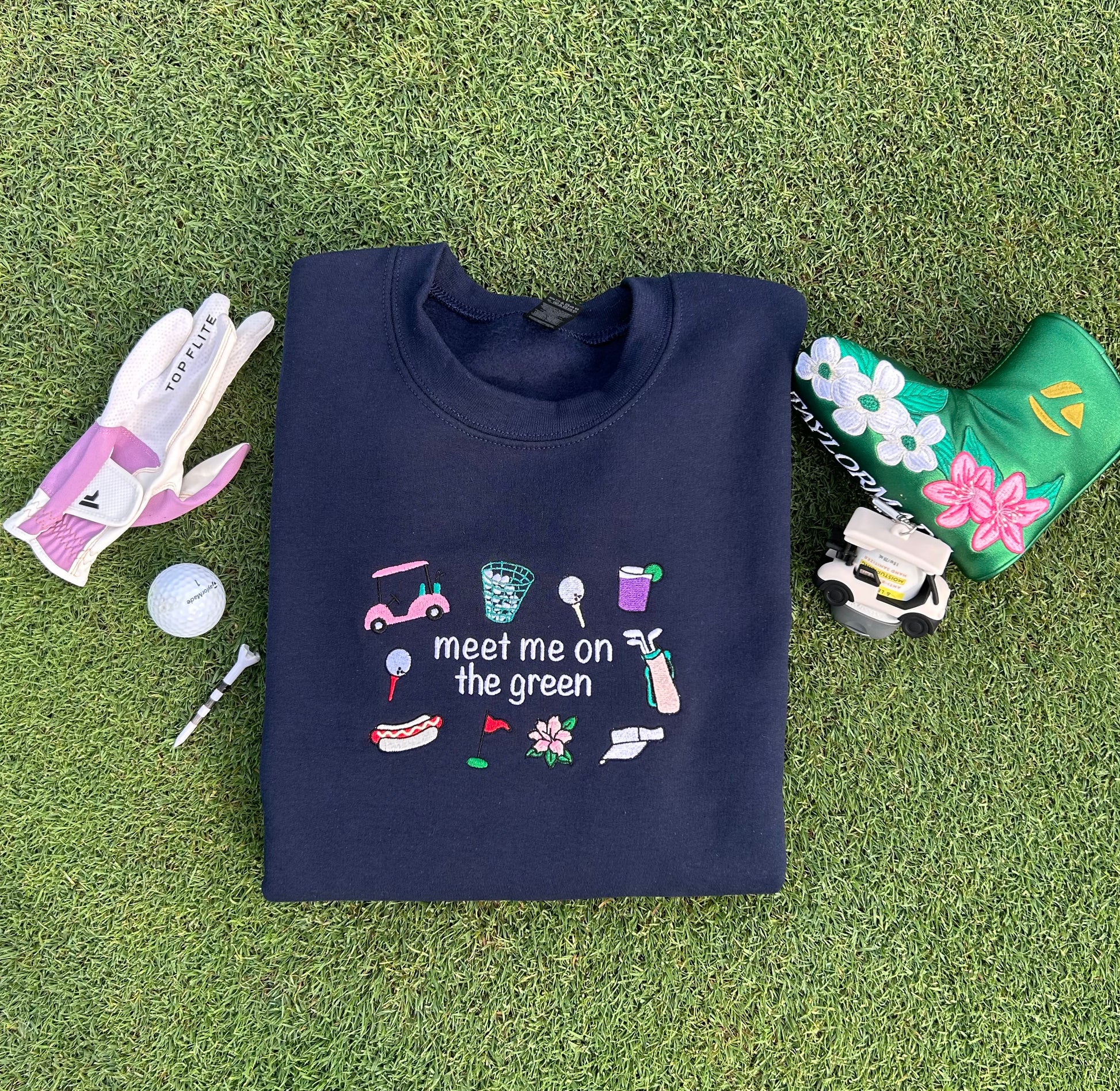 Whether you're hitting range balls at golden hour, grabbing a hot dog at the turn, or sipping a transfusion from the cart cupholder — the Embroidered “Meet Me on the Green” Sweatshirt or Tee is made for golfers who play for the vibes as much as the scorecard.