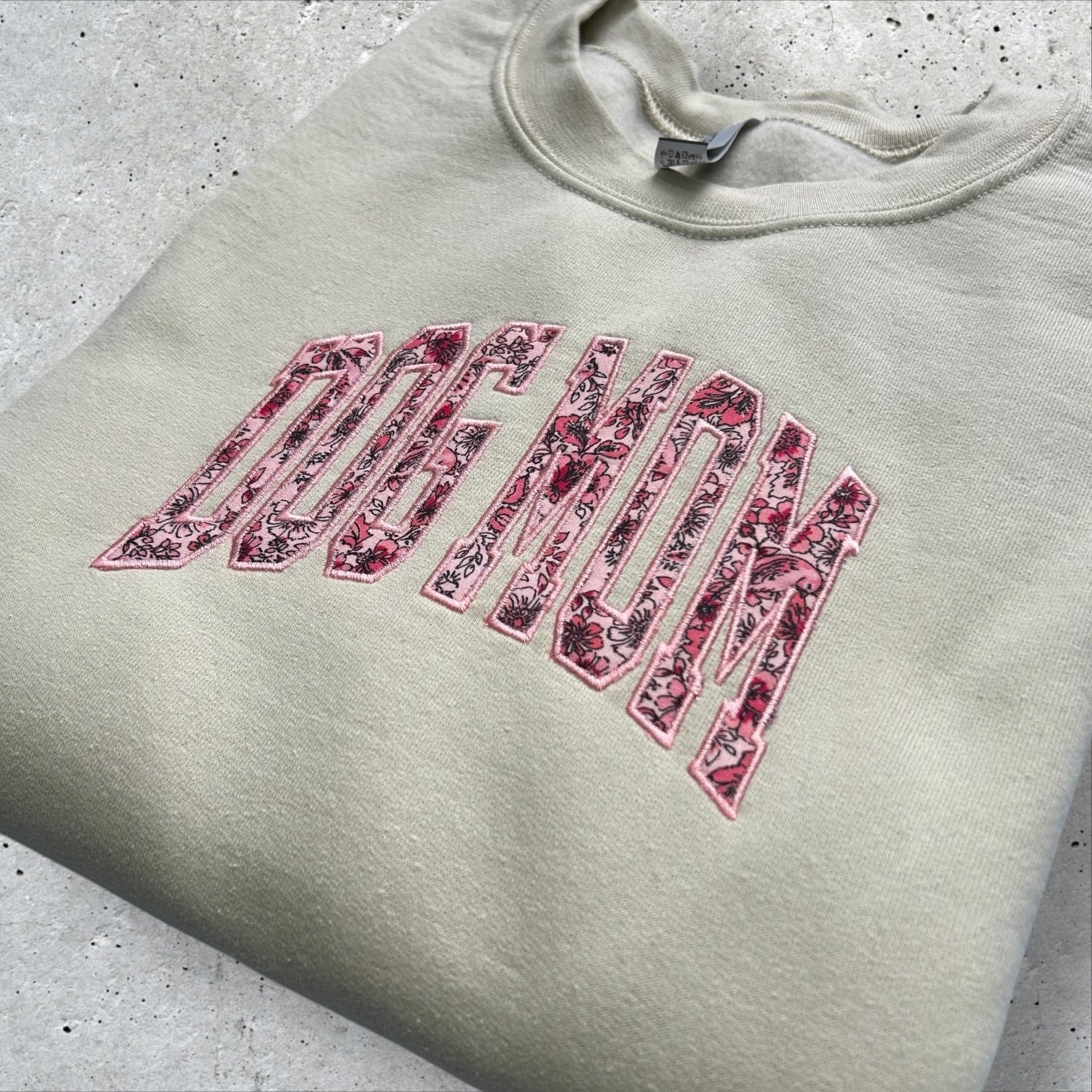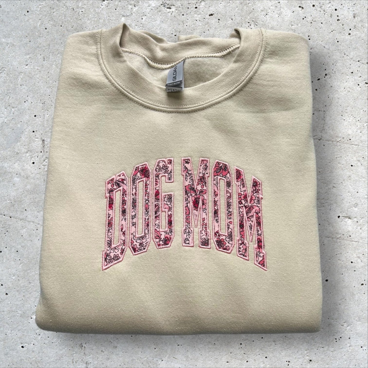 - Adorable "Dog Mom" embroidered graphic with pink floral accents for a feminine, loving touch