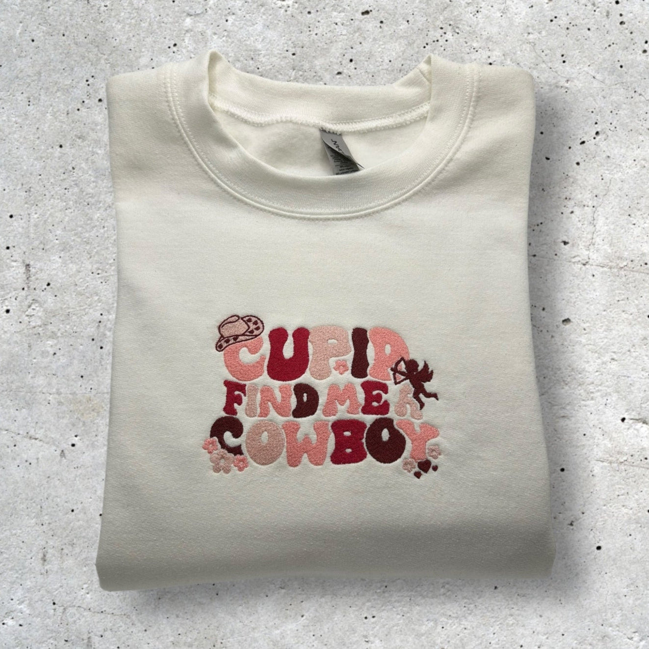 Add a touch of country love to your wardrobe with the Gildan Cupid Find Me a Cowboy Embroidered Sweatshirt—because every cowgirl deserves her cowboy, and Cupid might just need a little help!